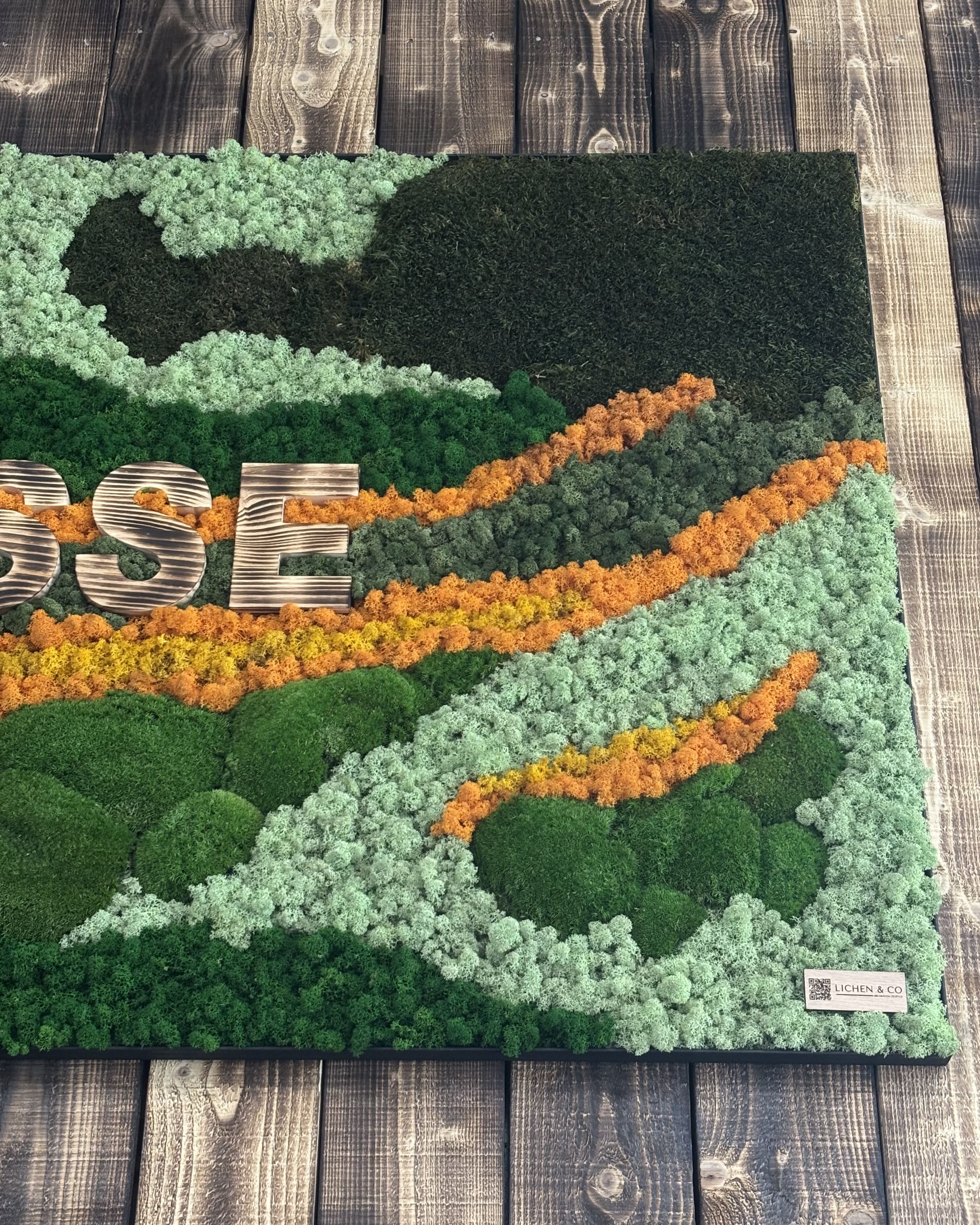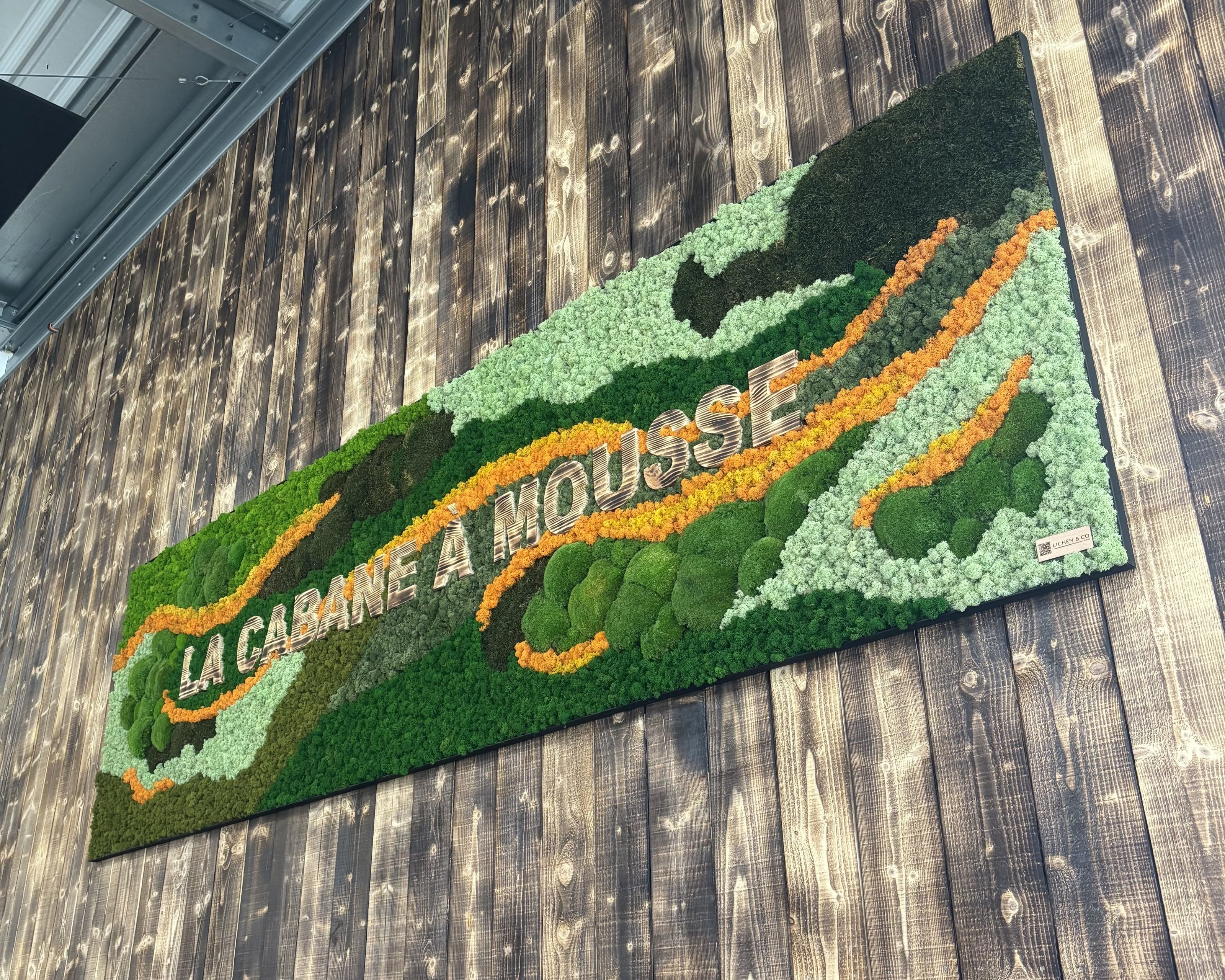 L’objectif était d’obtenir un tableau végétal proportionné à l’espace, en cohérence avec l’identité du lieu grâce au lichen orange et jaune, et harmonisé avec l’ambiance grâce aux lettres en bois brûlé.