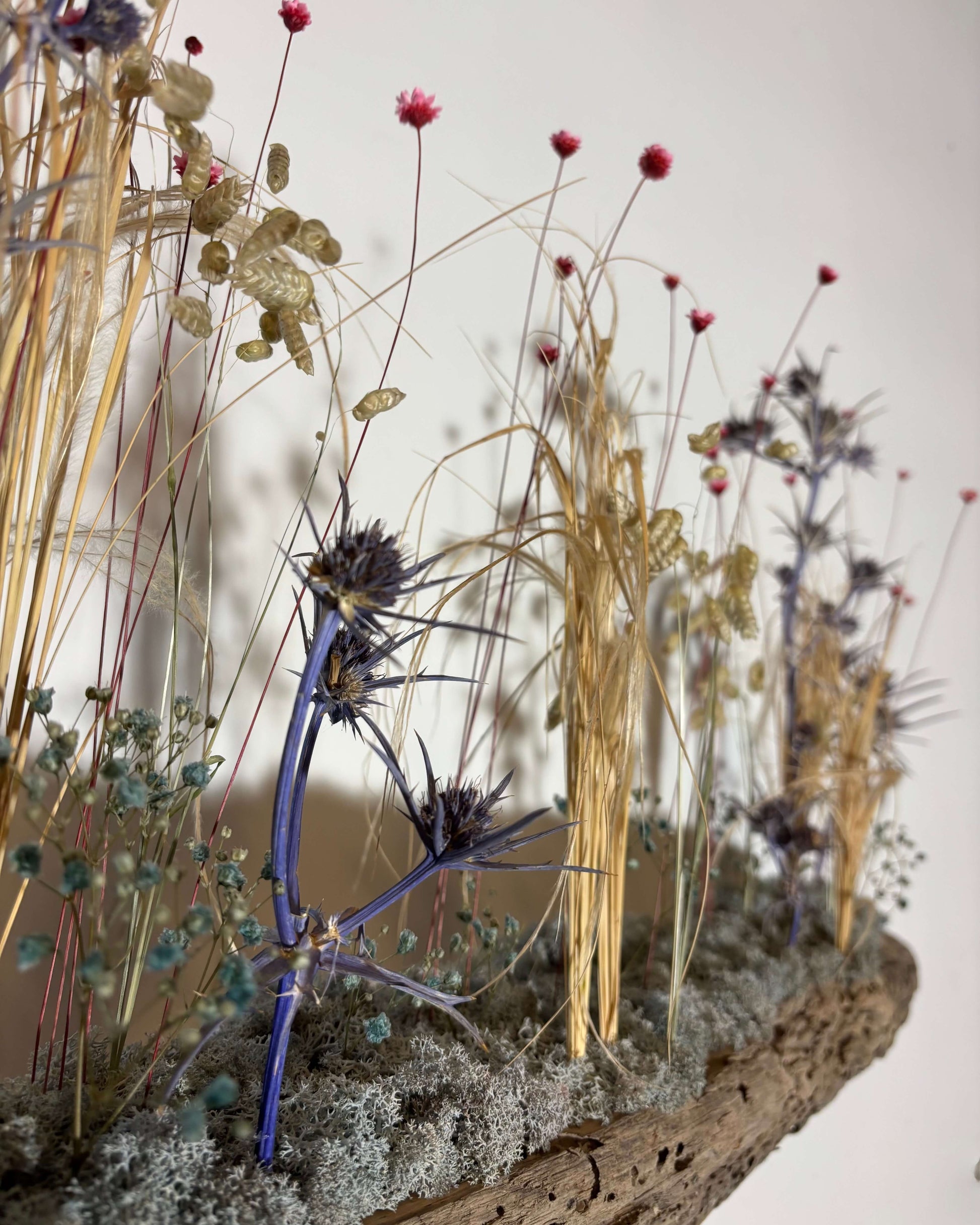 Assortiment de chardons bleus, graminées naturelles, gypsophile bleue et glixia rose, 100% naturels